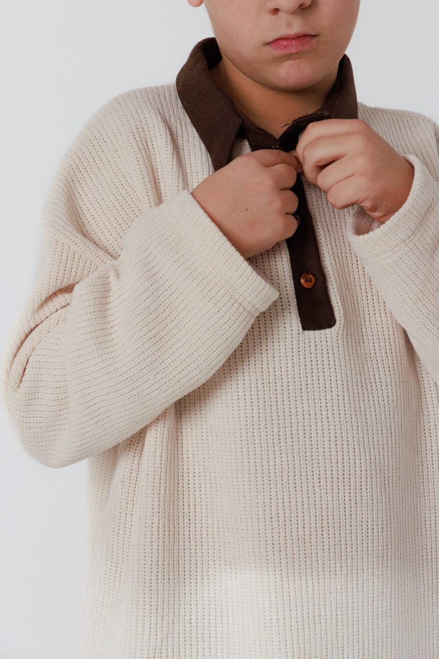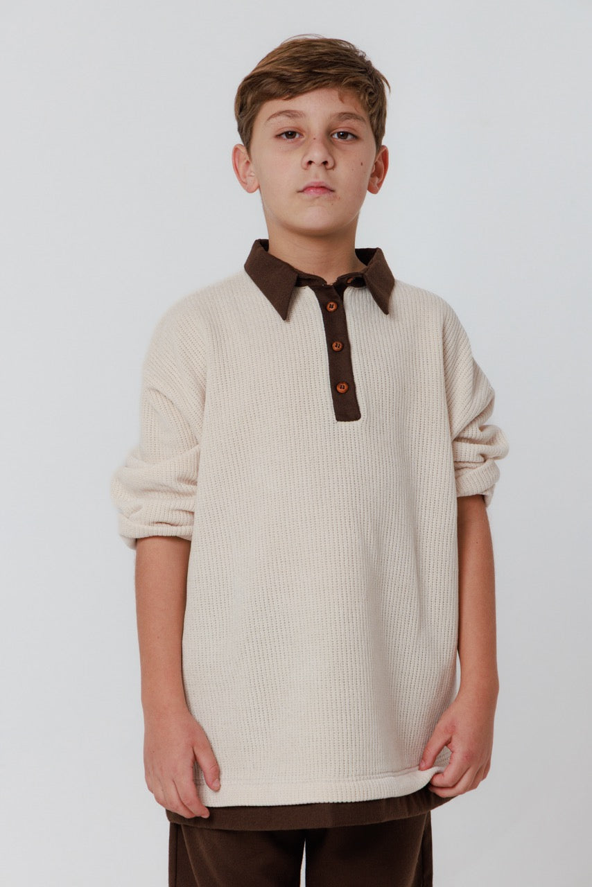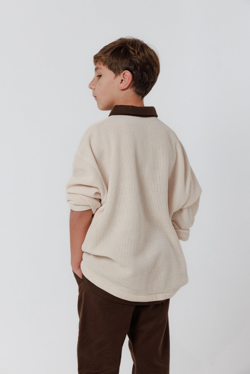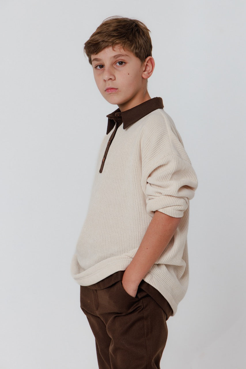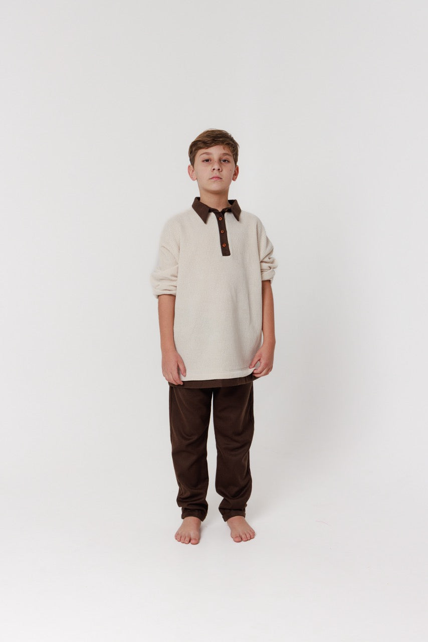 This handmade children’s set is a refined expression of natural materials and understated elegance. The shirt is crafted from soft, breathable cotton in a warm ivory tone, featuring a subtle textured weave that adds depth and character. Its relaxed silhouette is complemented by a contrasting brown collar and button placket, lending a tailored touch while preserving a comfortable, effortless feel.