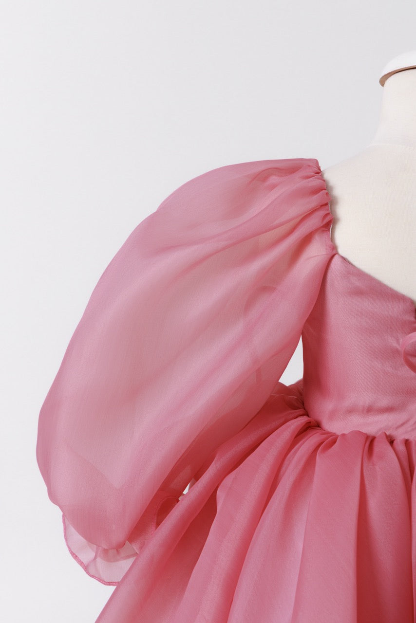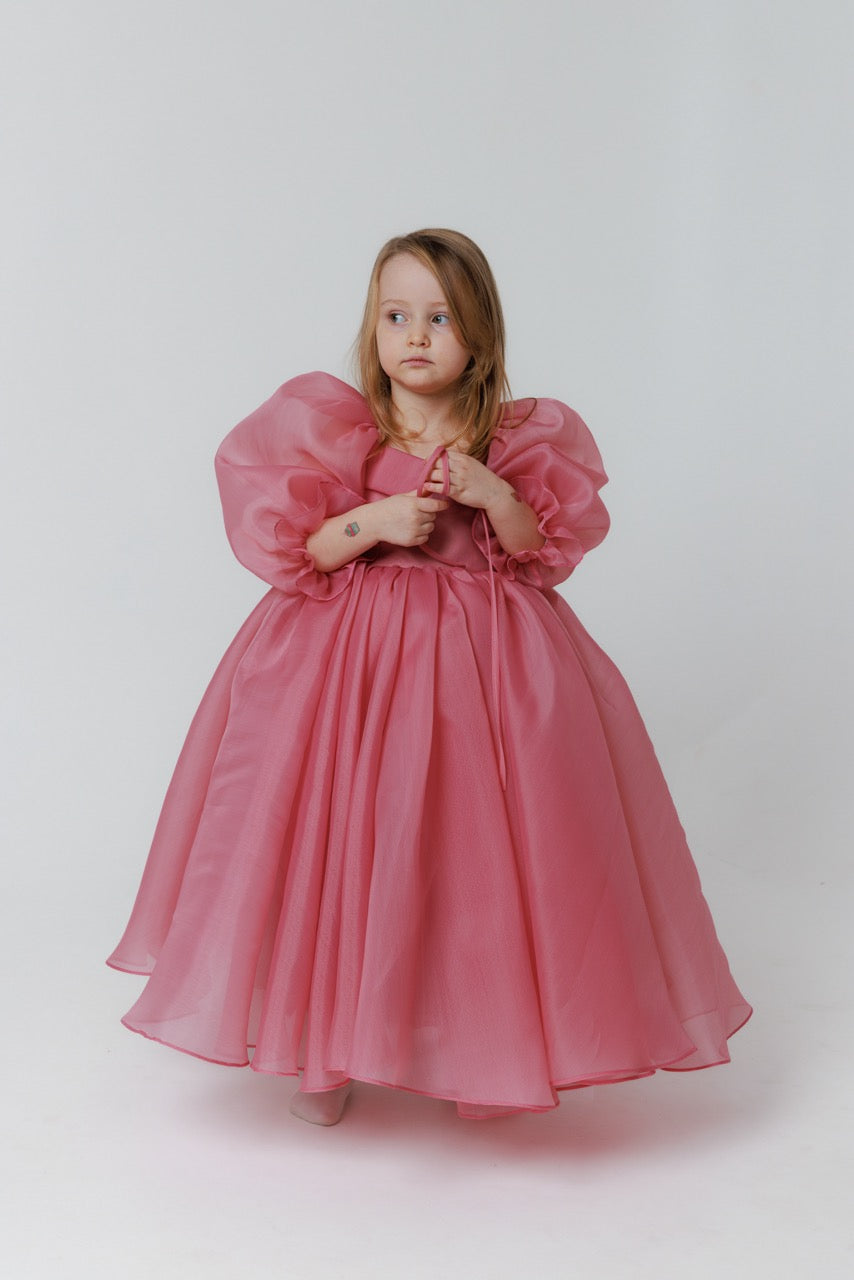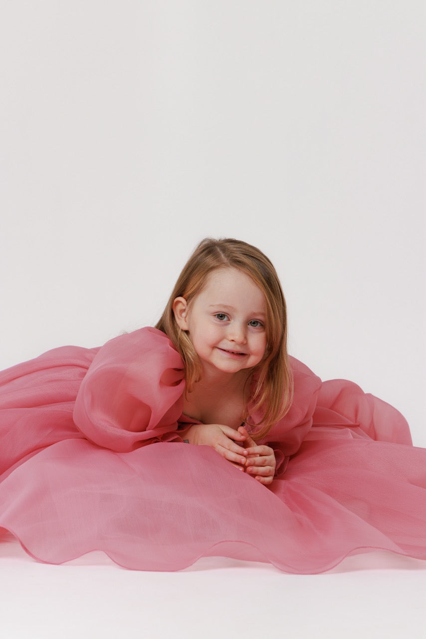 This handcrafted children’s dress is a poetic expression of lightness and refined elegance. Created from sheer organza in a delicate blush pink hue, the fabric floats effortlessly, giving the dress an ethereal, almost dreamlike presence. Its soft translucence enhances the sense of volume while maintaining an airy, graceful silhouette.