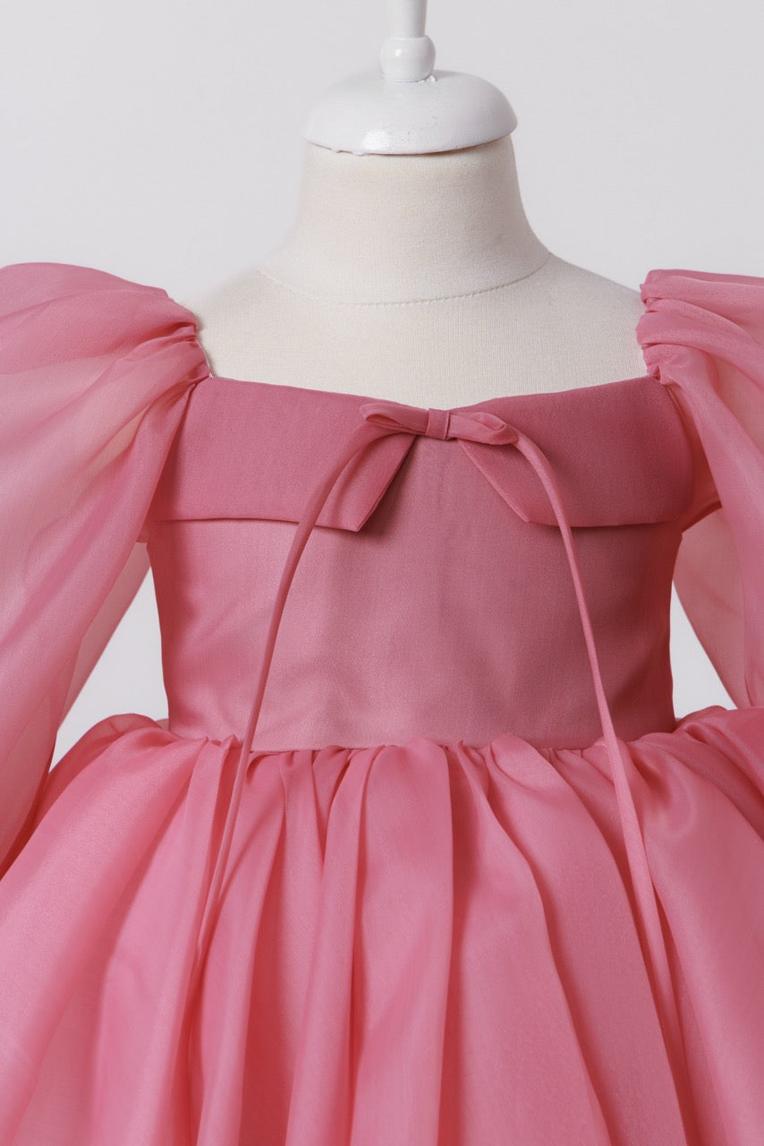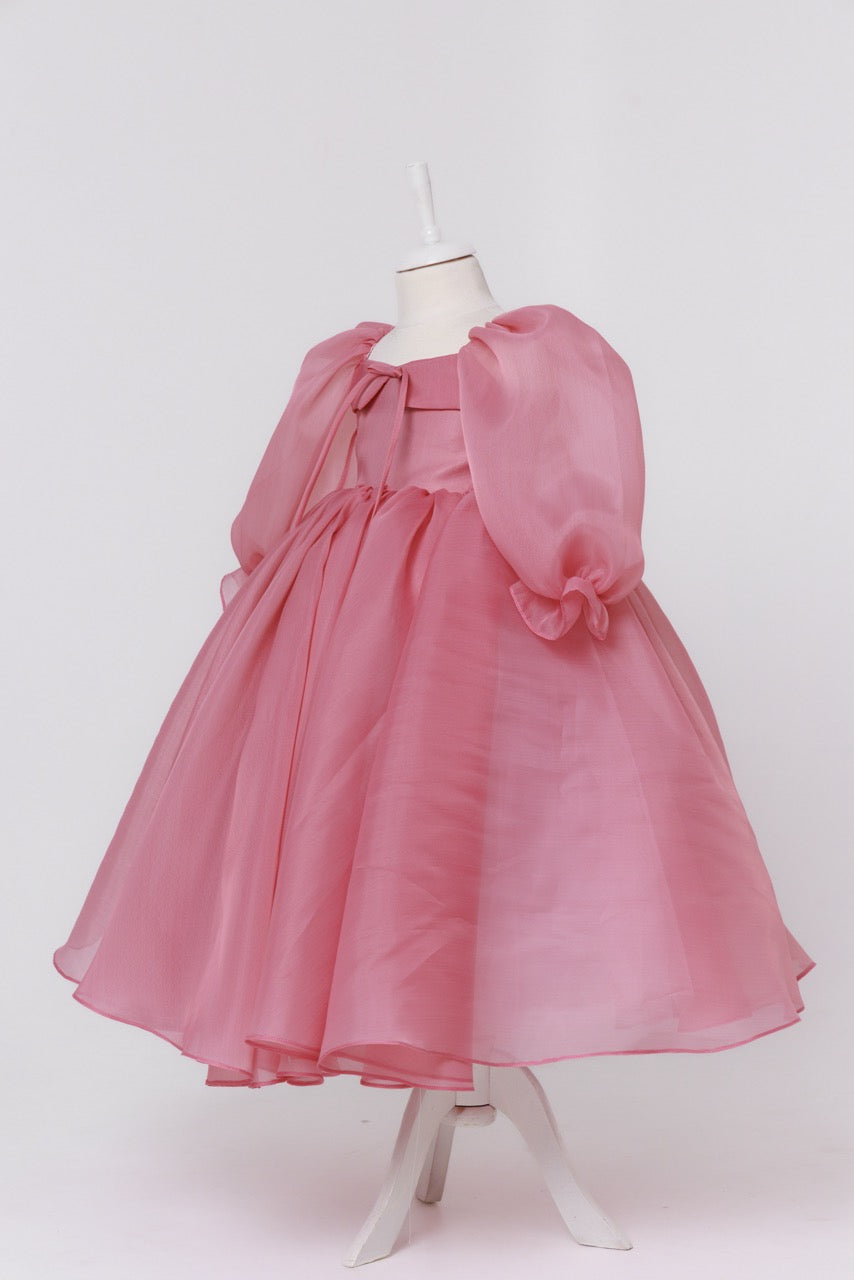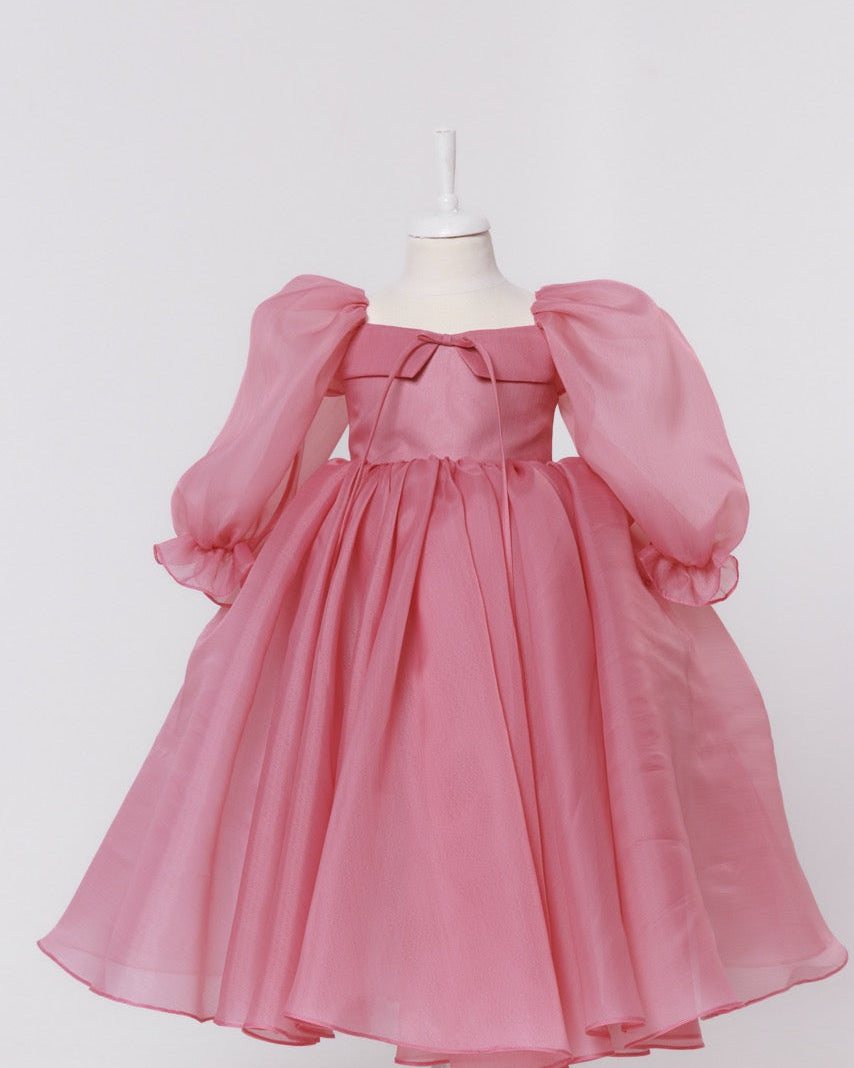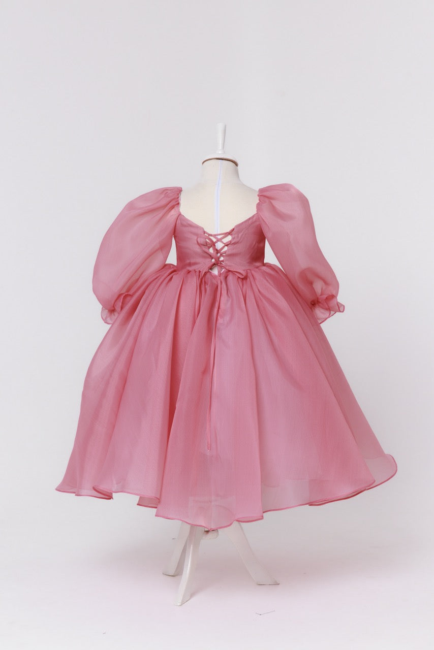 This handcrafted children’s dress is a poetic expression of lightness and refined elegance. Created from sheer organza in a delicate blush pink hue, the fabric floats effortlessly, giving the dress an ethereal, almost dreamlike presence. Its soft translucence enhances the sense of volume while maintaining an airy, graceful silhouette.