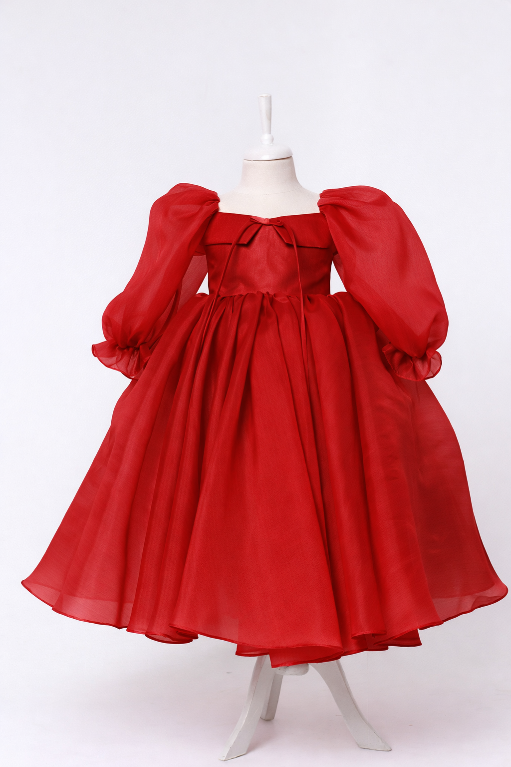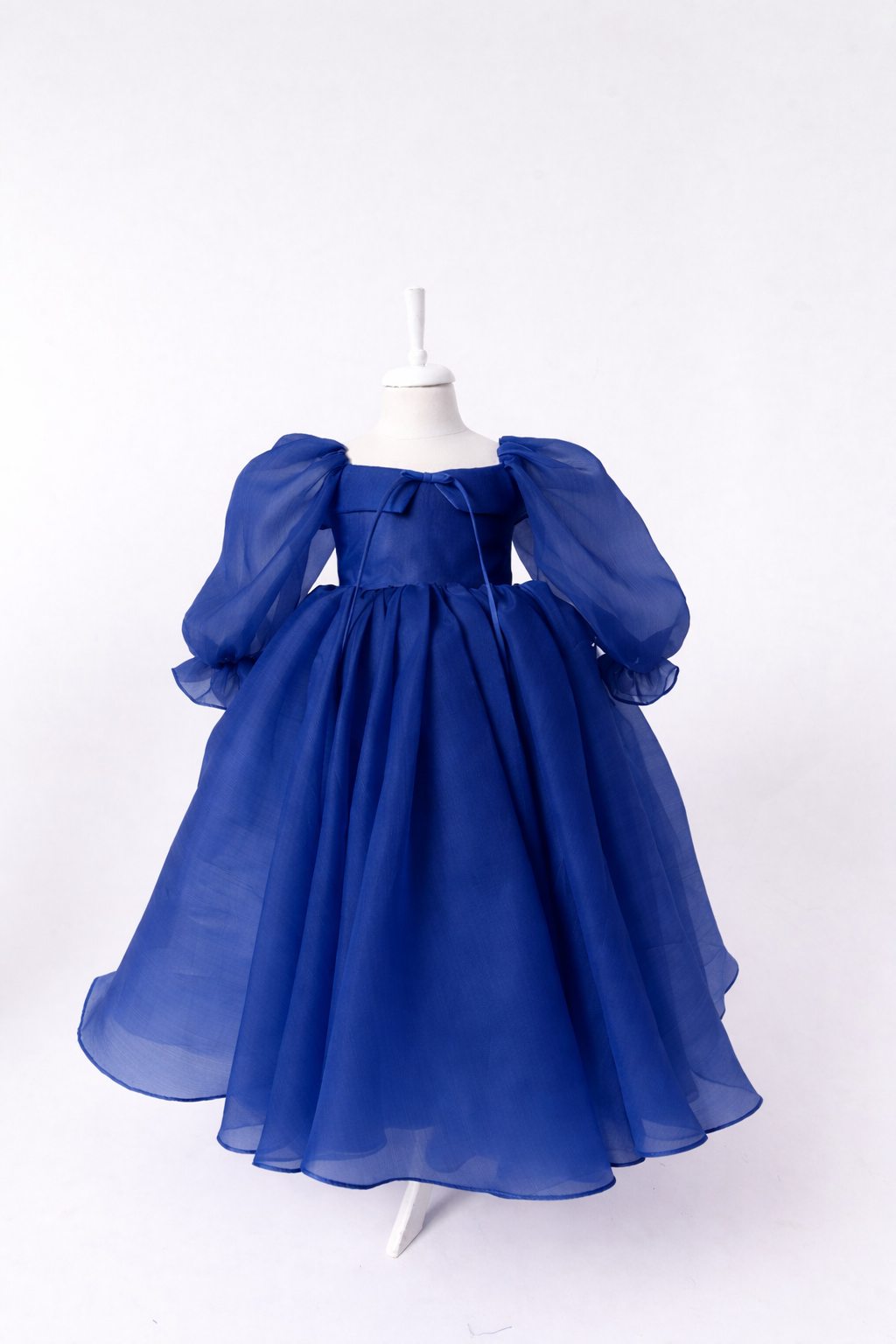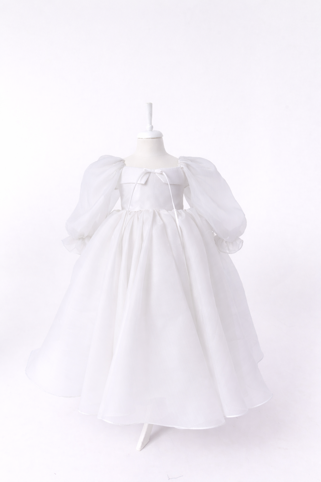 The design features a gently structured bodice with a subtle neckline detail and a slender tie that adds a touch of romantic charm. Billowing long sleeves, softly gathered at the cuffs, lend a couture-inspired softness, while the generously flared skirt cascades in fluid layers, creating beautiful movement with every step.