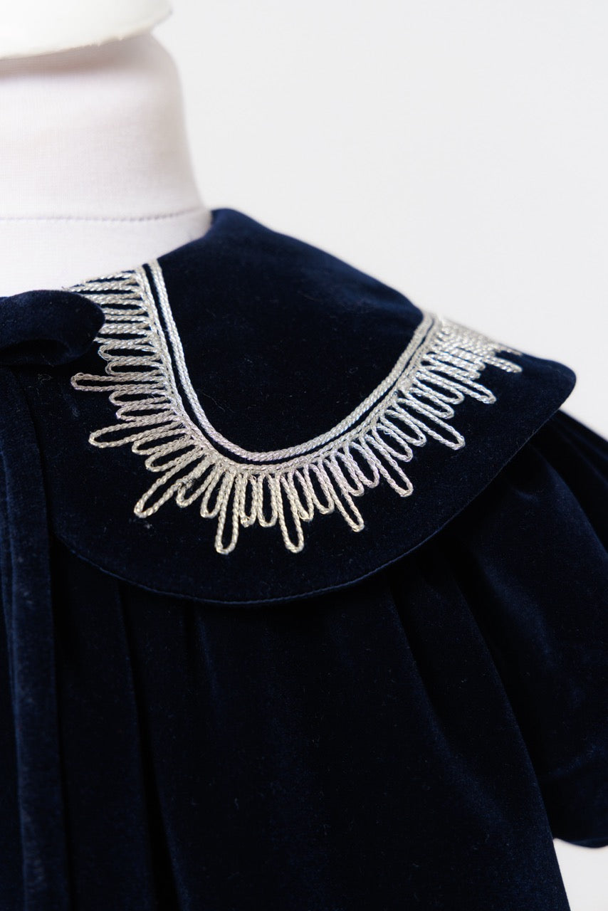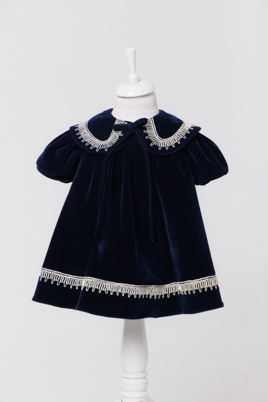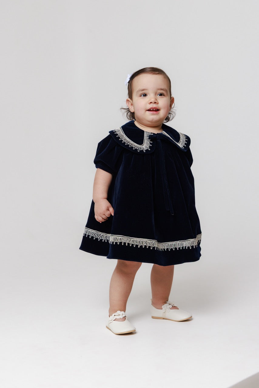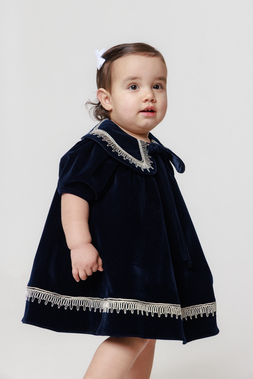 An exquisite expression of timeless elegance, this luxury baby dress is crafted from sumptuous velvet with a soft, lustrous finish that catches the light beautifully. The deep, refined hue lends a classic sophistication, while the gently structured silhouette drapes gracefully for both comfort and poise.