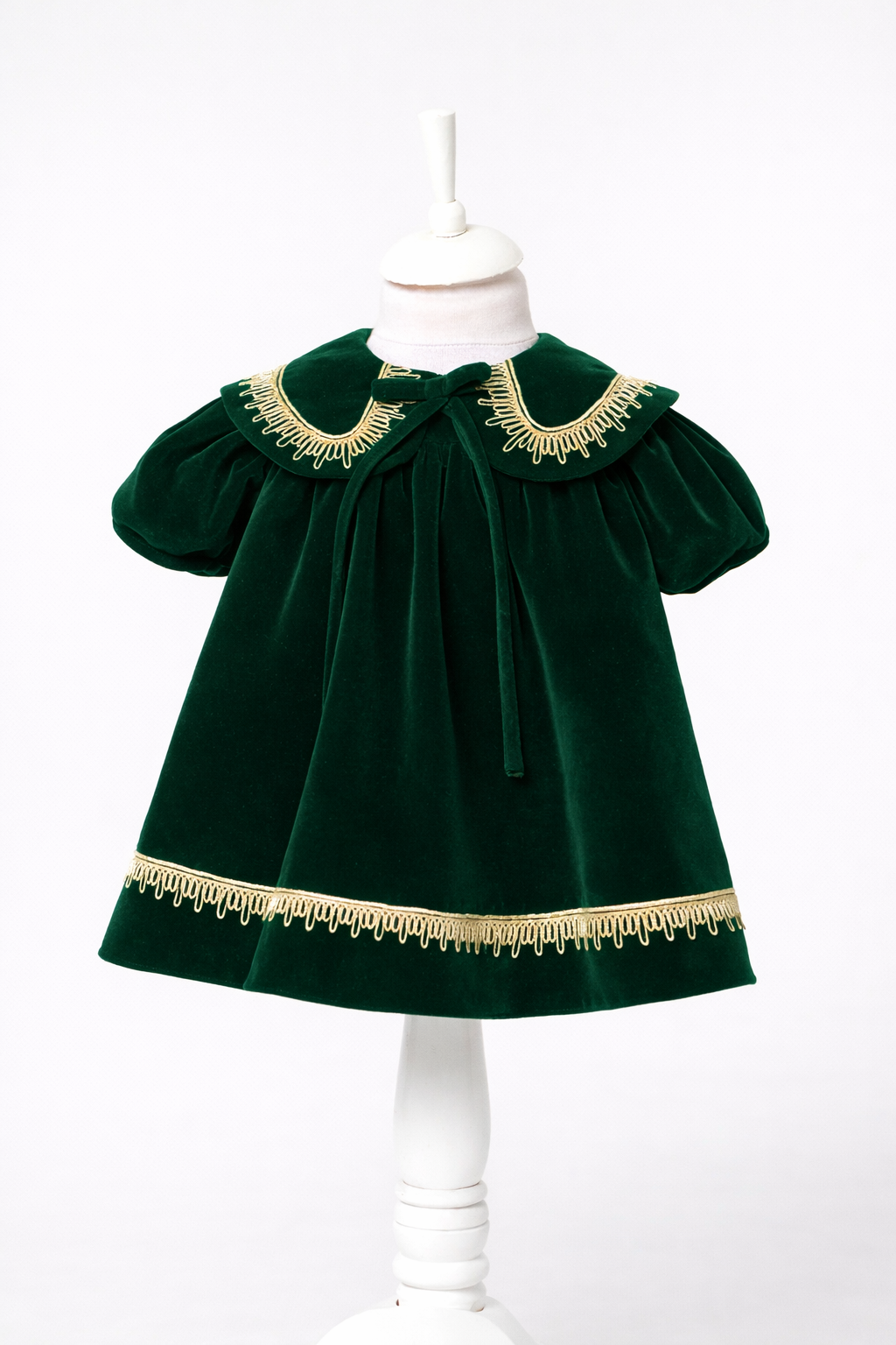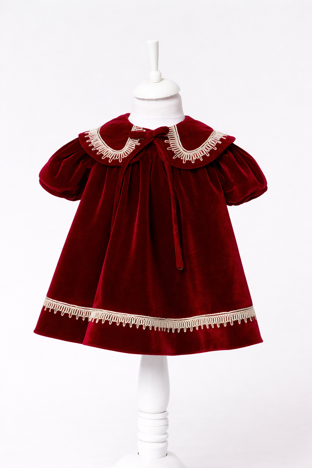 A delicately detailed collar, trimmed with fine embroidery, frames the neckline with heirloom-inspired charm, echoed by matching embellishment along the hem. Subtle pleating adds volume and movement, enhancing the dress’s refined character without overwhelming its simplicity. Designed with meticulous attention to detail, this piece balances old-world elegance with modern craftsmanship—perfect for special occasions, portraits, and treasured moments.