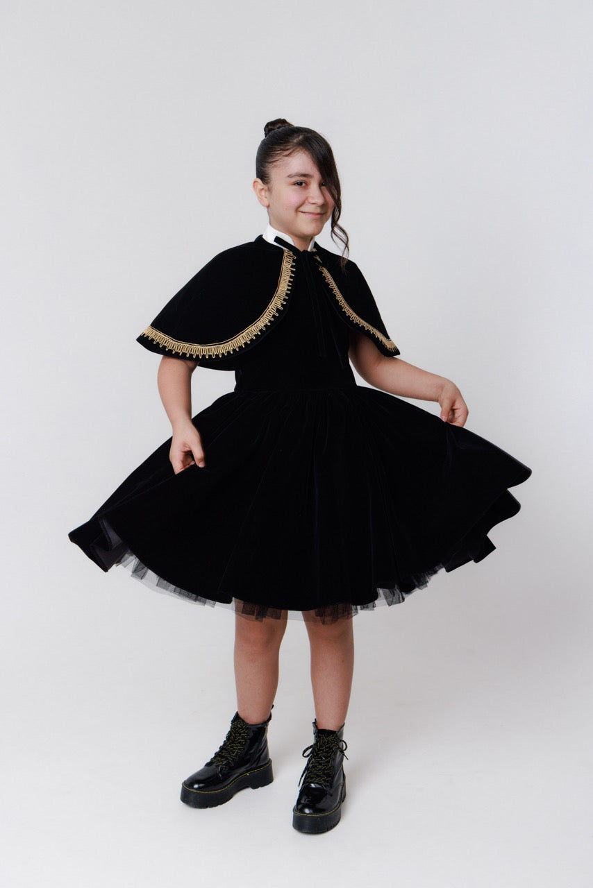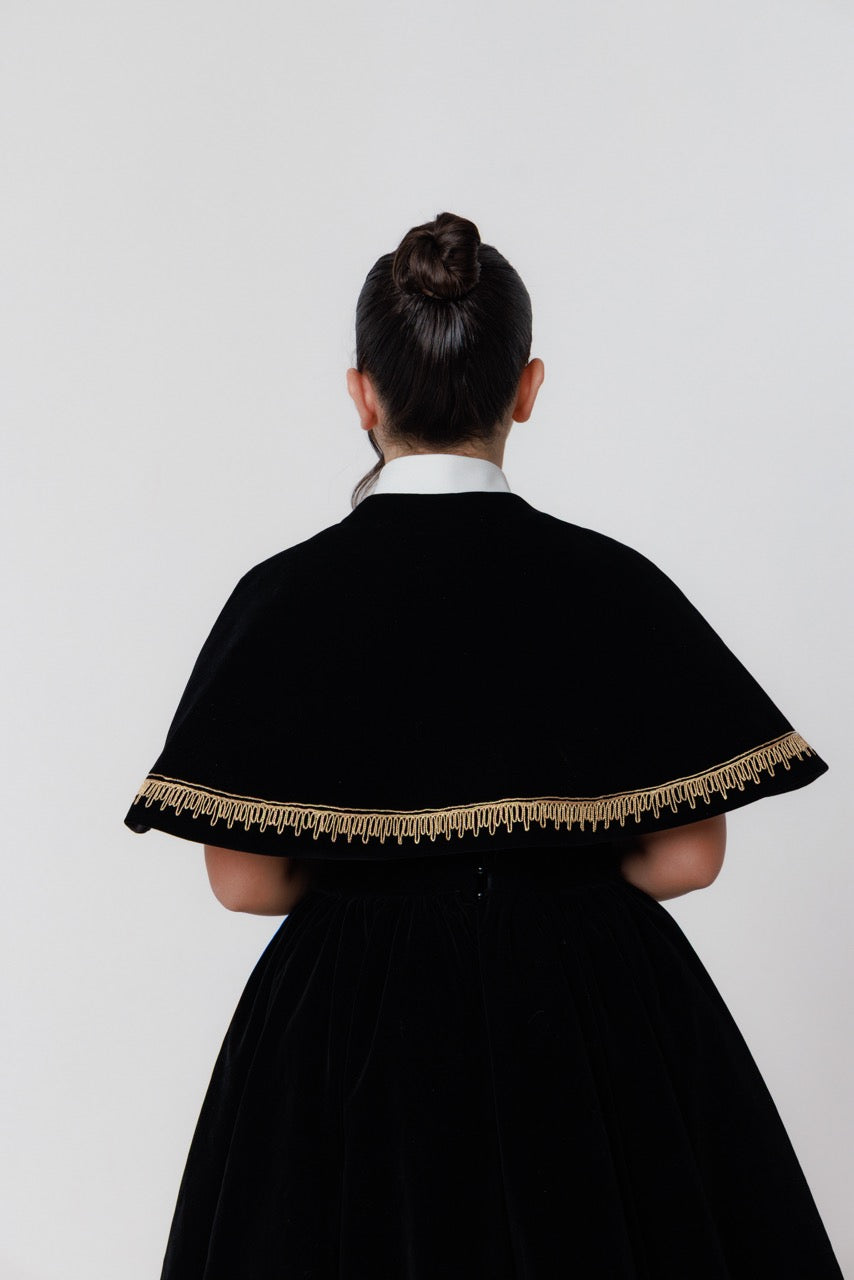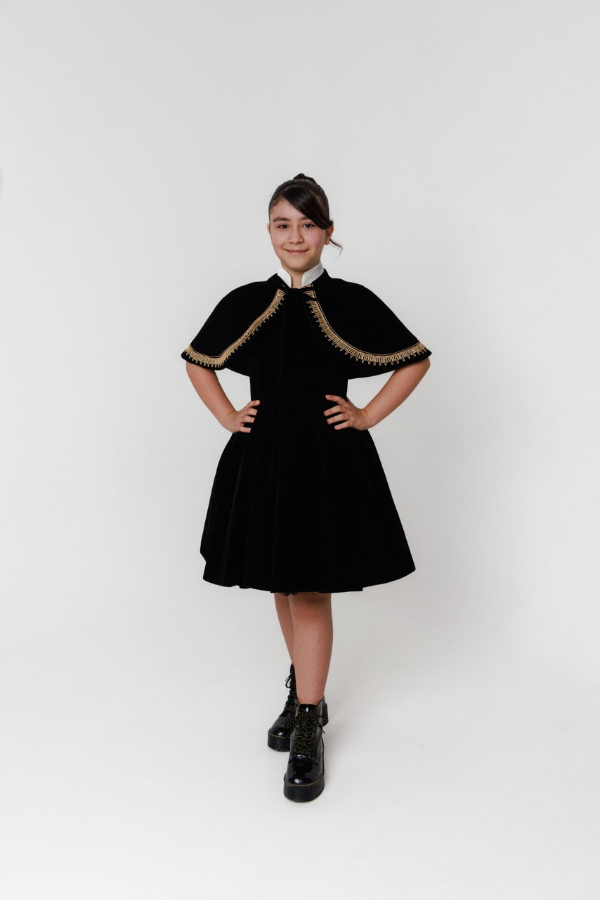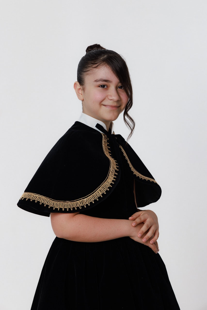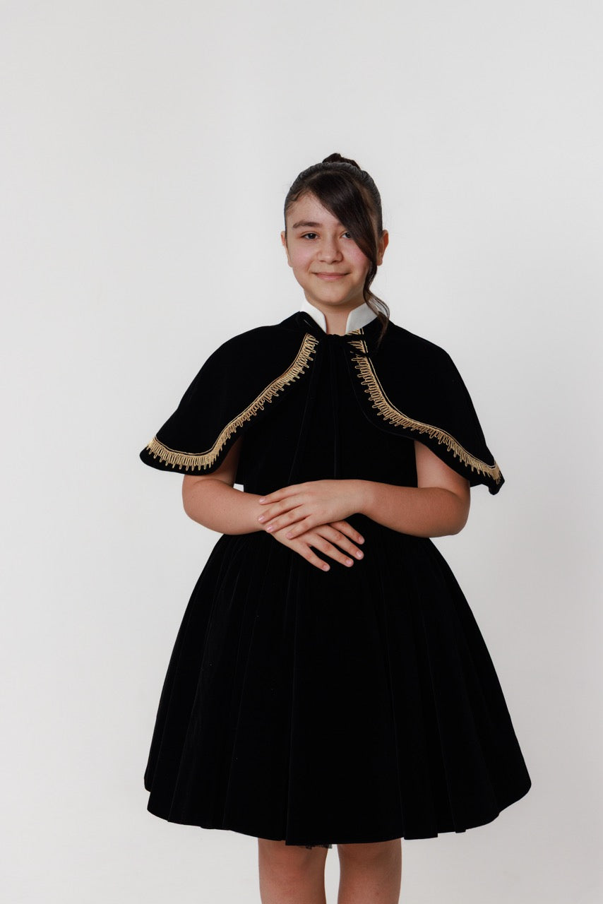 This handmade children’s dress is a refined blend of classic elegance and artisanal detail. Crafted from rich black velvet, it features a beautifully structured silhouette with soft pleating that gives the skirt graceful volume and movement. The bodice is complemented by a short cape-style overlay, delicately trimmed with ornate gold embroidery that adds a regal, heirloom-quality accent without overpowering the design.