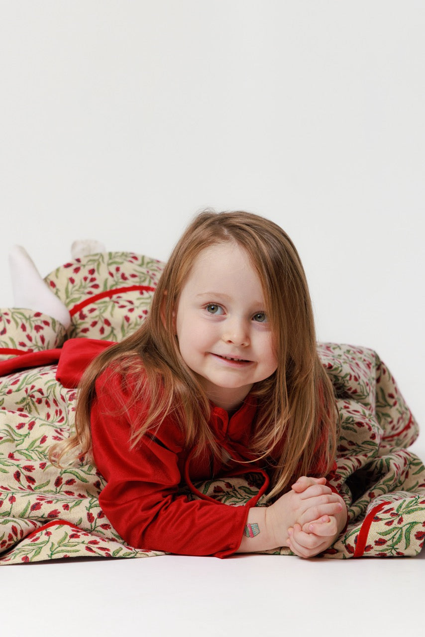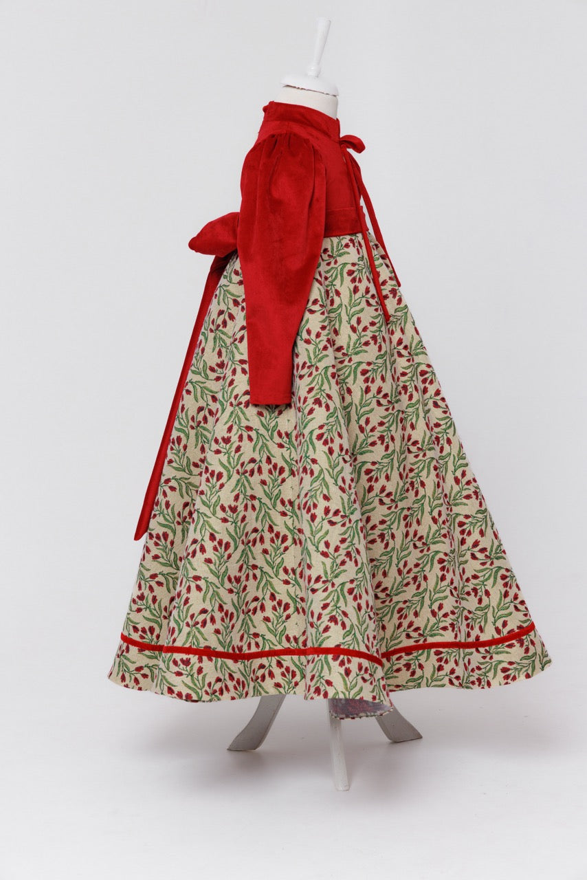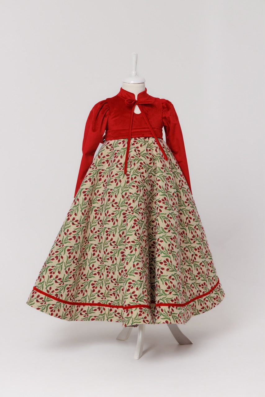 This handcrafted children’s dress is a rich expression of timeless elegance and artisanal refinement. The bodice is fashioned from sumptuous red velvet, offering a soft, luminous texture that brings warmth and depth to the design. Its gently structured shape, long sleeves, and delicately tied neckline evoke classic charm while maintaining a graceful, childlike softness.