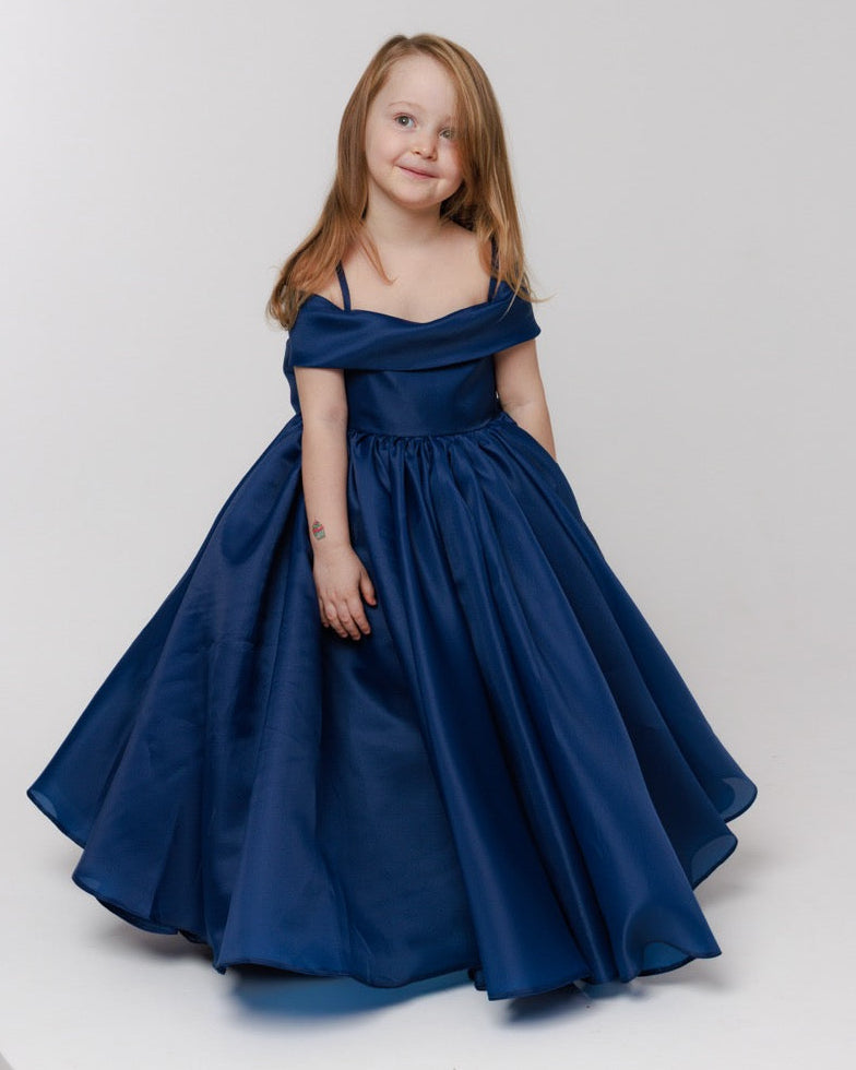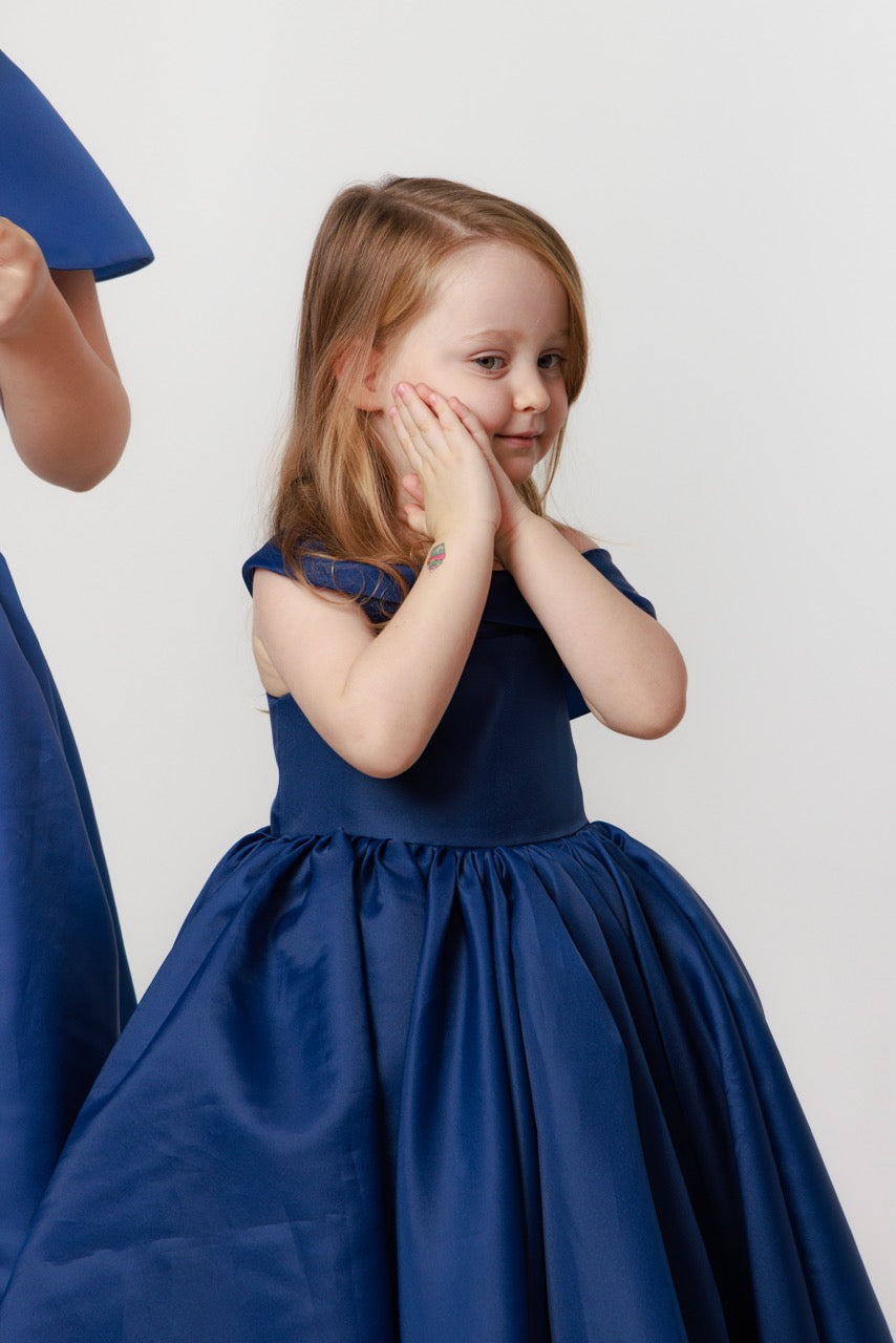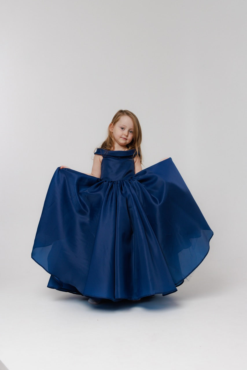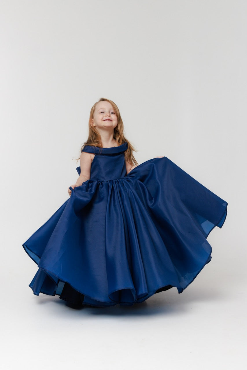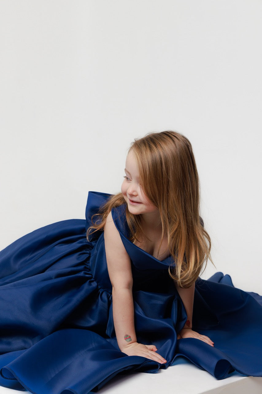 This children’s dress is a graceful statement of modern elegance, crafted from flowing organza in a deep, refined navy blue. The fabric’s subtle translucence and gentle sheen create a sense of lightness, allowing the gown to move beautifully while maintaining a structured, couture-inspired silhouette.