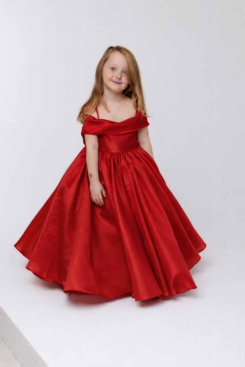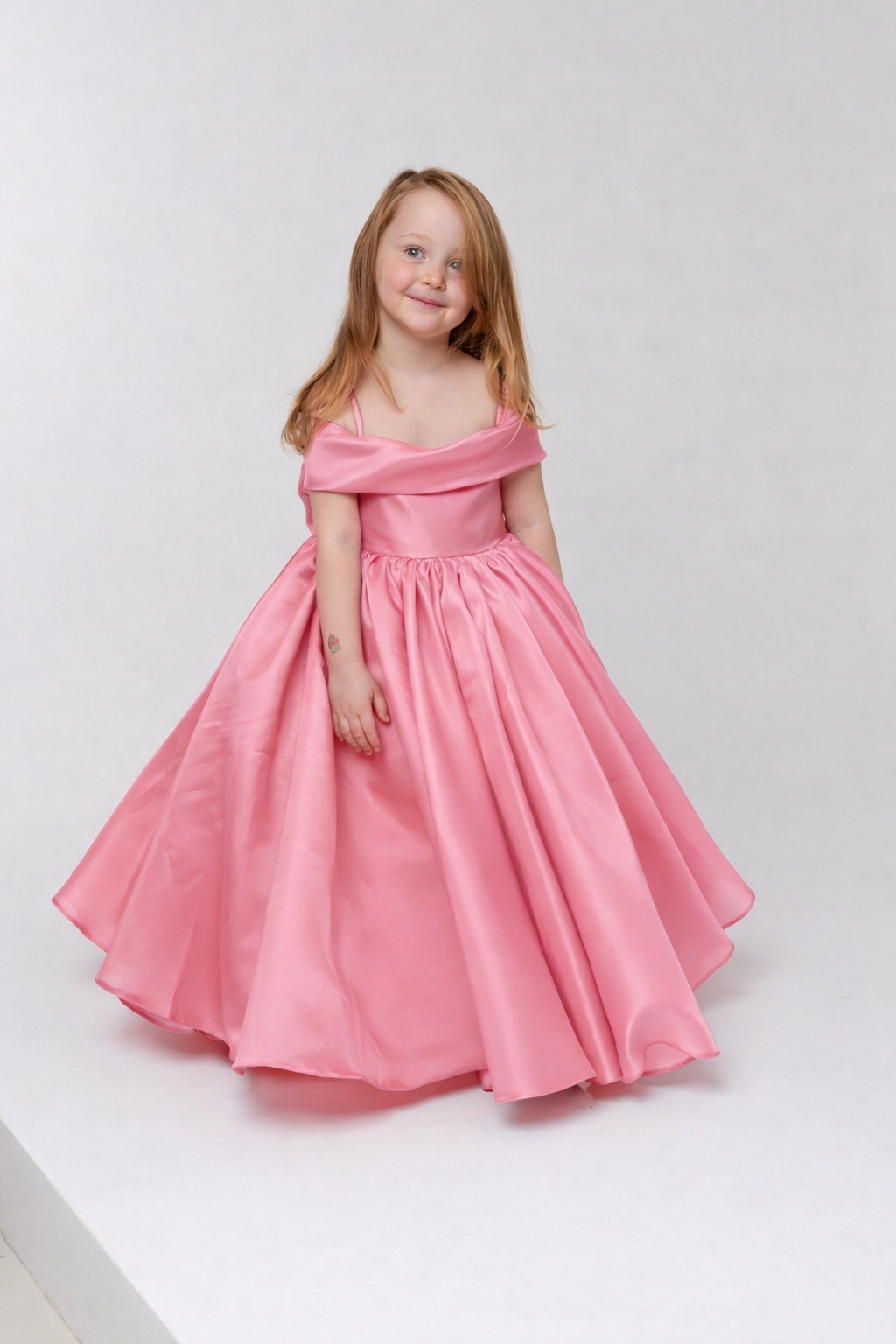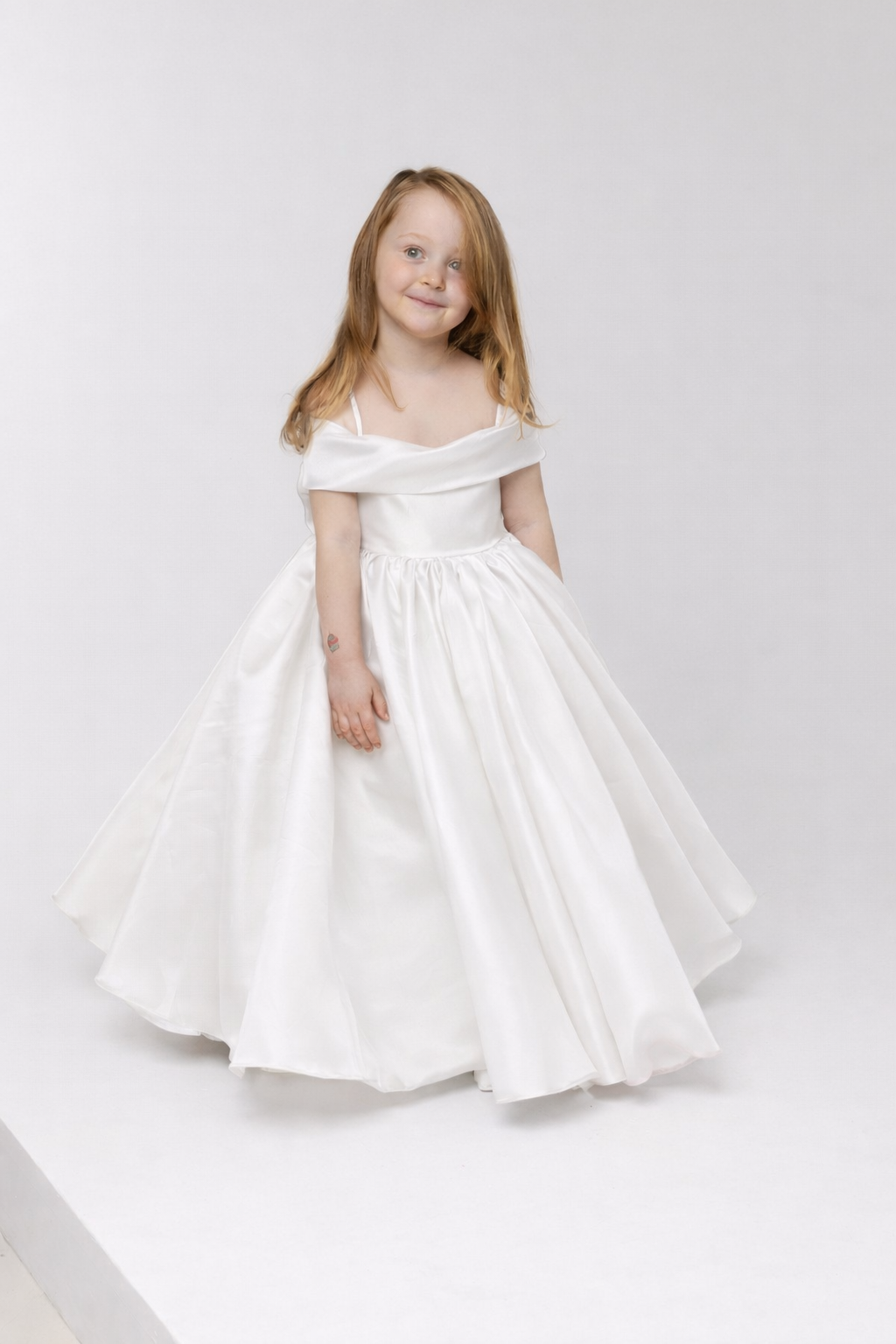 The off-the-shoulder neckline is softly draped, adding a touch of sophistication and contemporary charm, while delicate shoulder straps provide comfort and support. A fitted bodice flows into a voluminous, full-length skirt, where layered organza panels create depth, movement, and a dramatic yet refined presence.