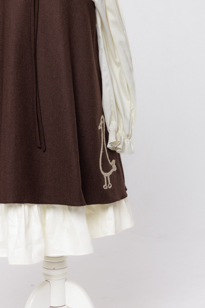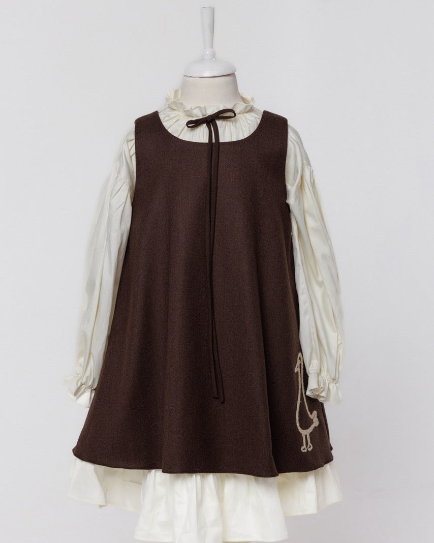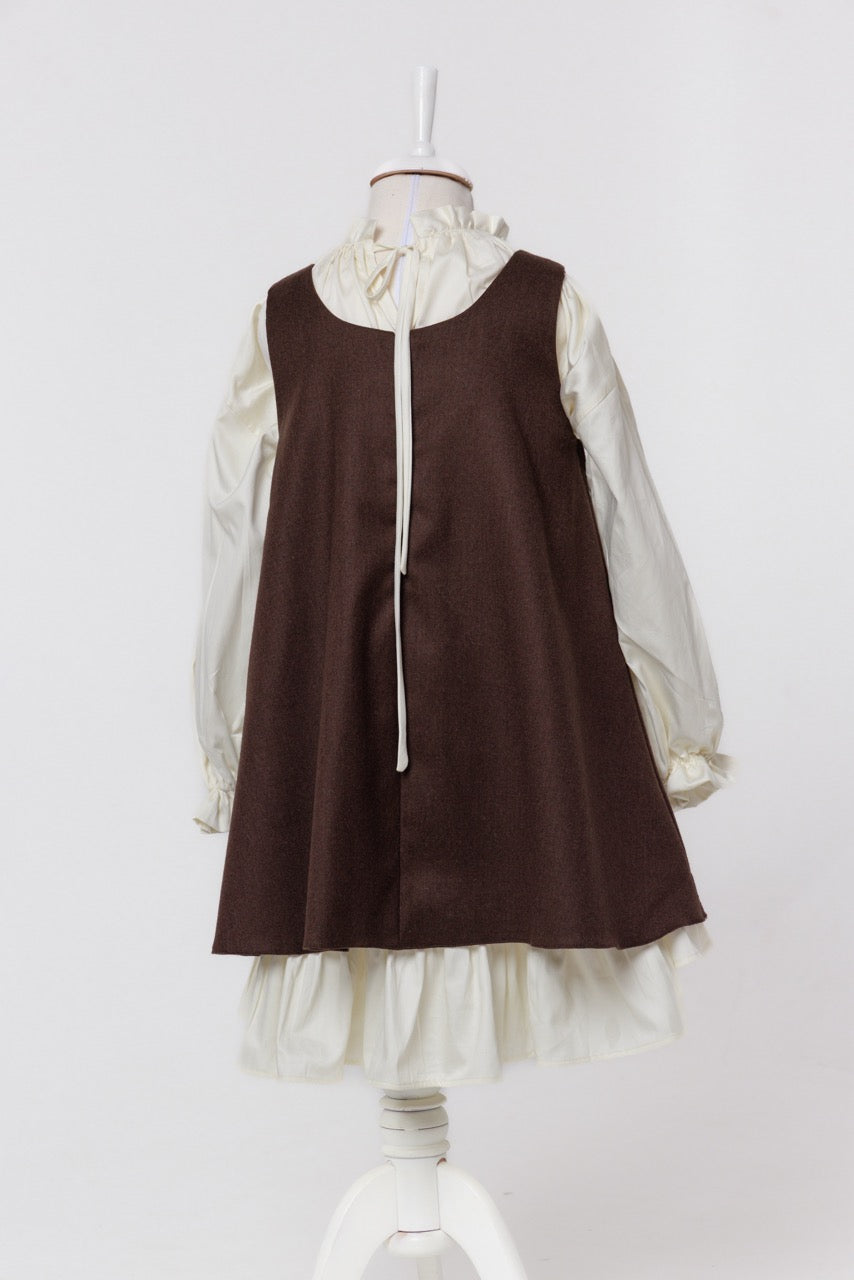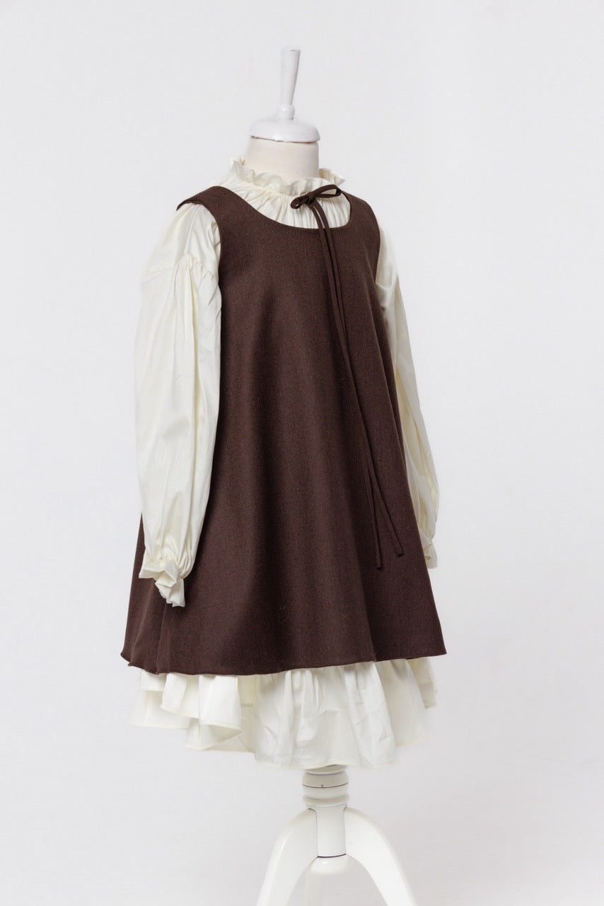 This handmade children’s dress is a graceful harmony of natural materials and timeless design. The outer layer is crafted from fine wool in a rich, earthy brown, offering warmth, structure, and a softly tailored silhouette. Beneath it, a cotton underdress in a gentle ivory tone adds lightness and fluidity, creating a layered effect that moves beautifully with the child.